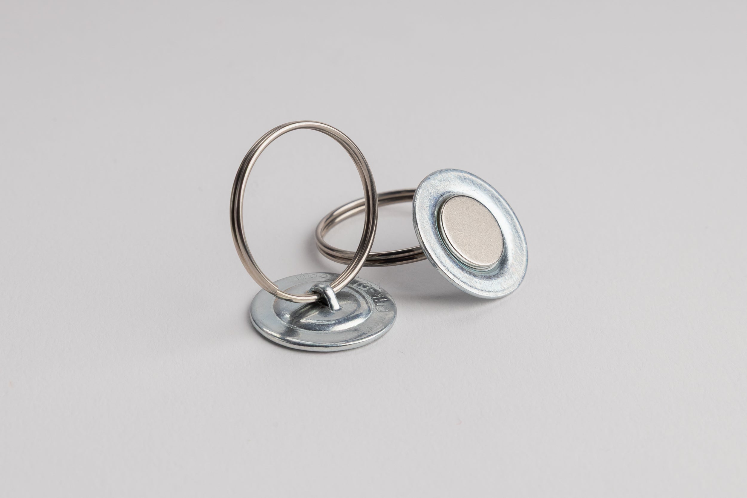 These neodymium ClikMagnets with one ring, “clik” to any metal that contains iron. They are ideal for attaching to the T-bars of most suspended ceilings, to industrial ceilings, and to the metal inside suspended FlatHats.